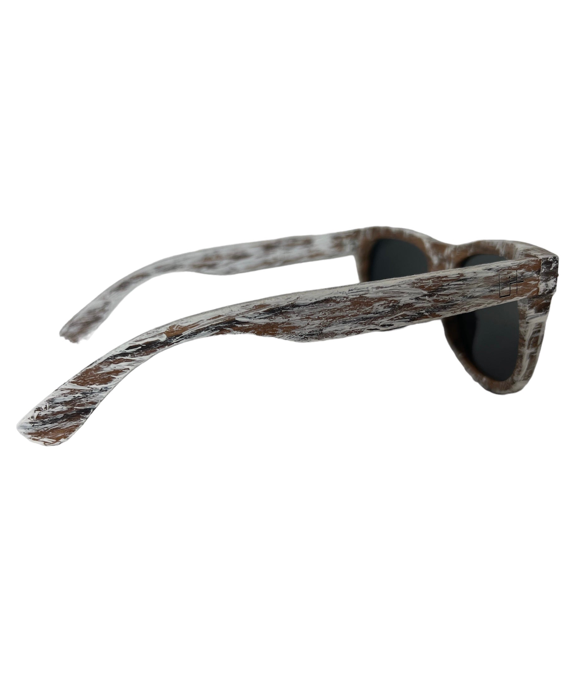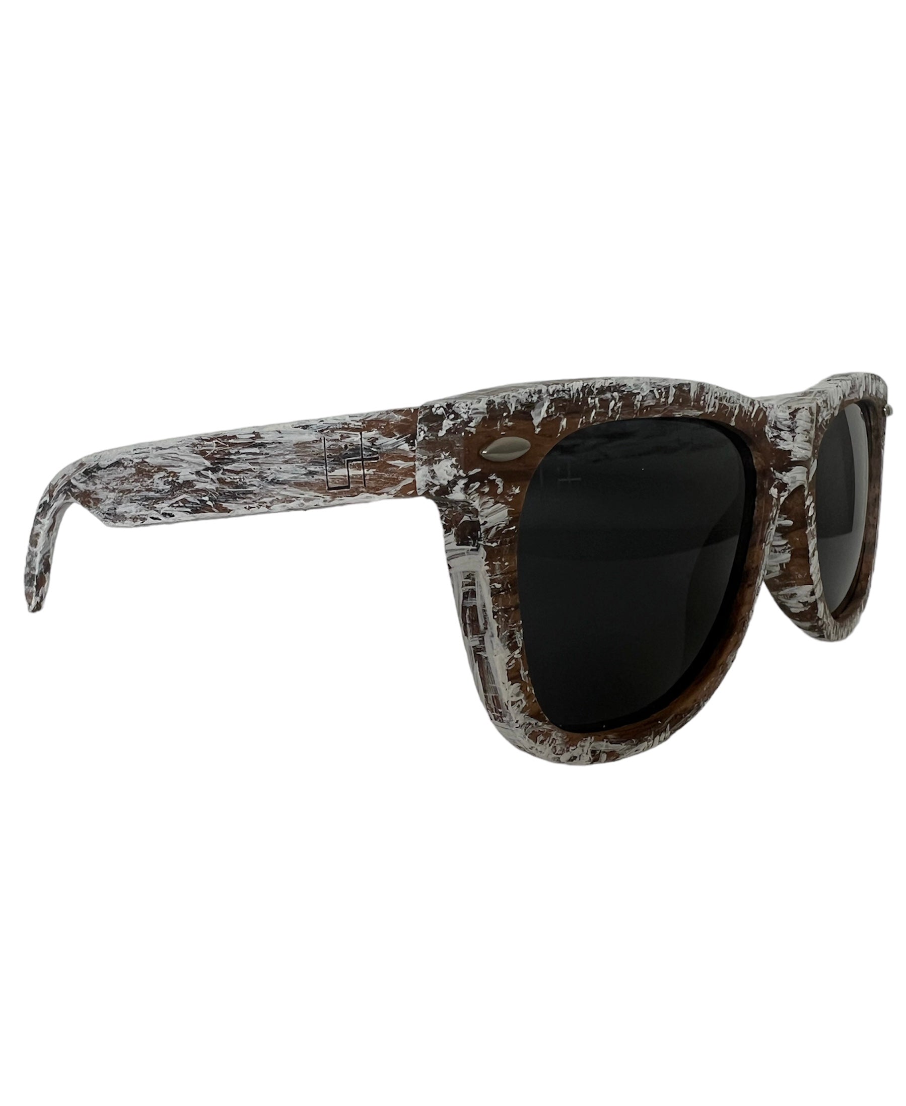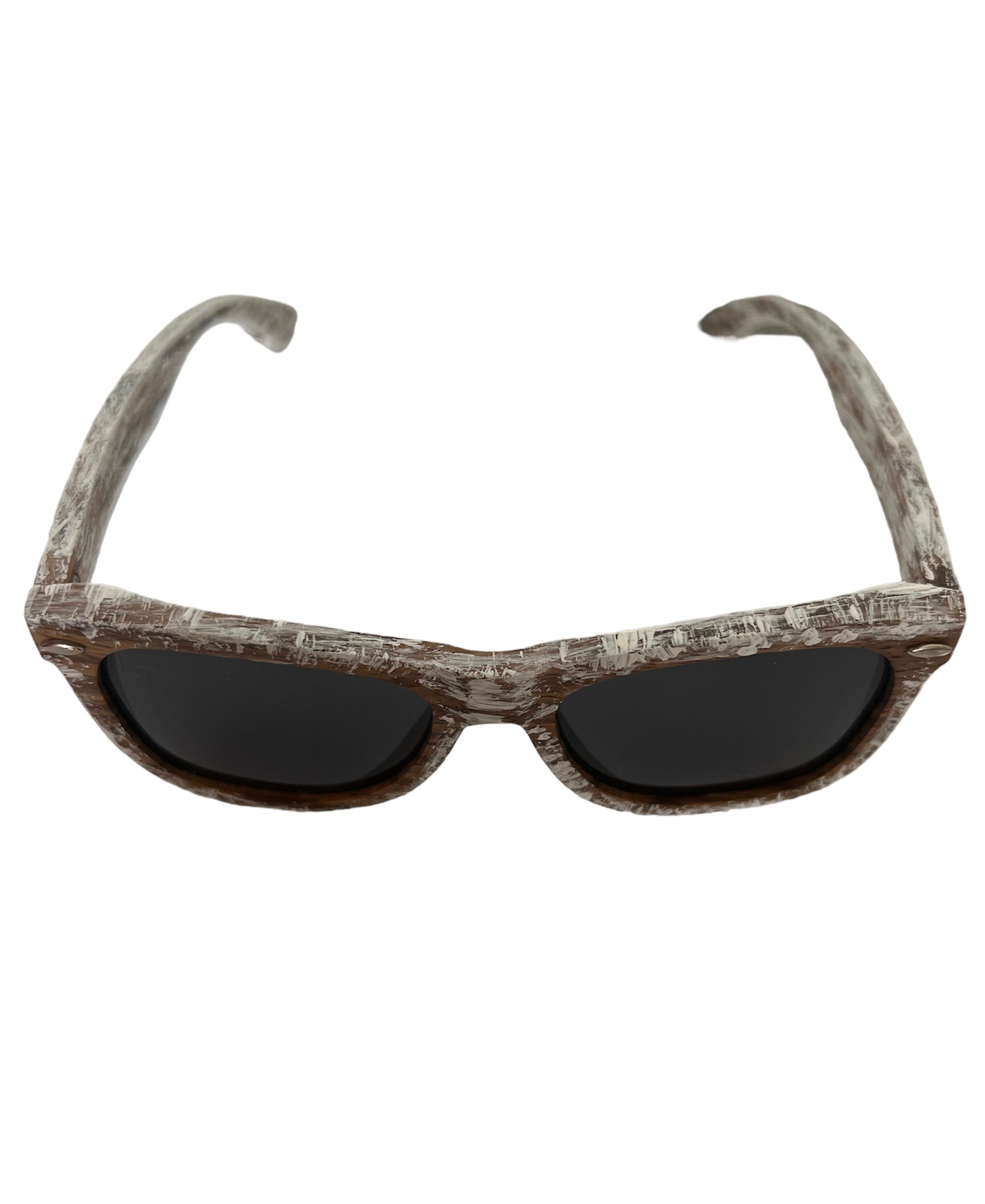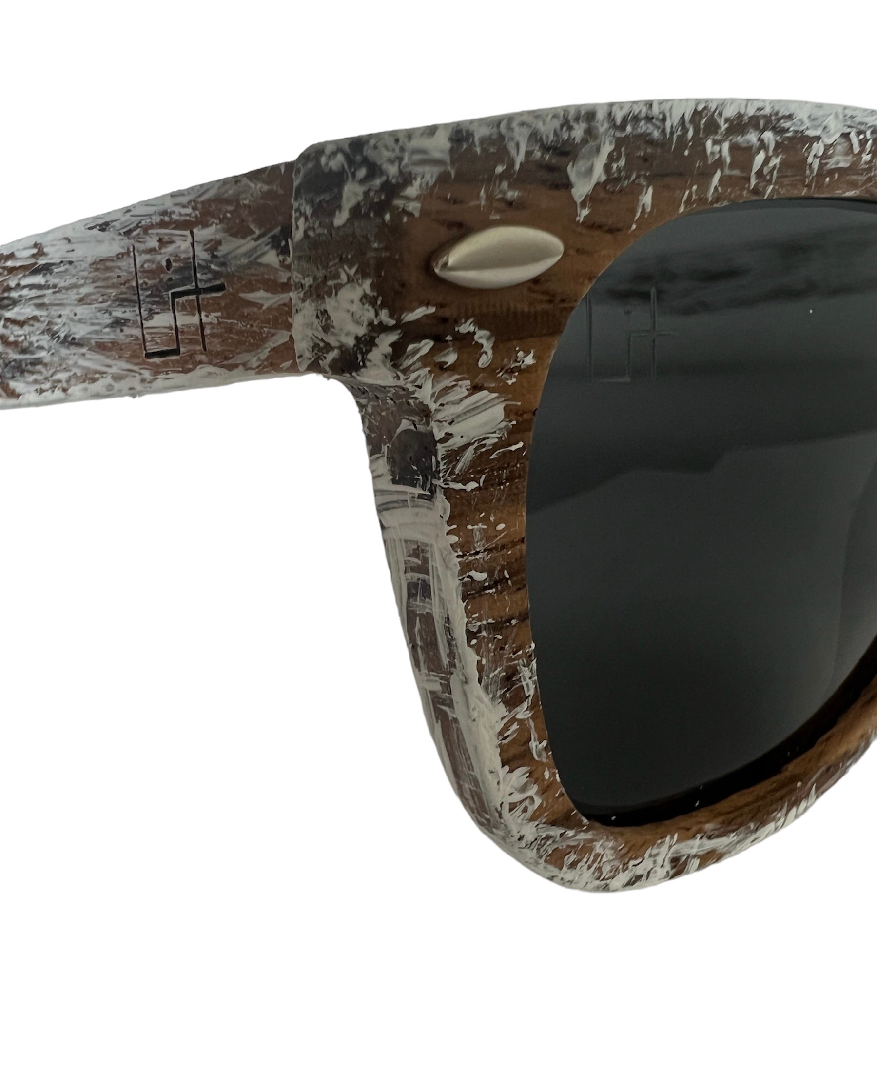 For this design we painted the wood frames white and then distressed it with a variety of hand tools. It has the appearance of reclaimed barnwood. Great for anyone who loves the reclaimed fashion and modern design. This style is very different from any other sunglass brands on the market. If you love or you work in the reclaimed wood industry...this style would really fit your lifestyle. Looks great for men or women.